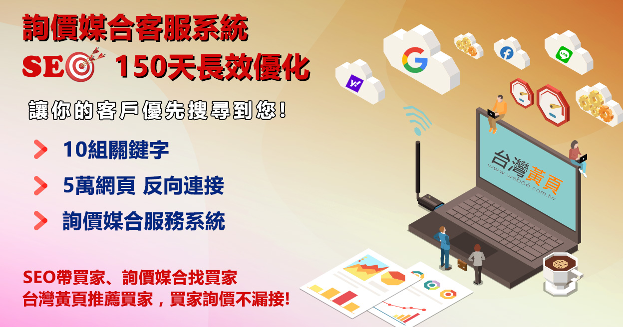 一、雲端客服24小時為您守候,將您推薦給買家 1. 相當一個業務助理,篩選精準買家,節省人事成本,做生意好Easy 2. 為您帶訂單、找訂單、即時推薦,詢價單不漏接 3. 跟據詢價媒合大數據,市場詢價趨勢分析,調整產業和關鍵字 二、優質外站反向連結,SEO長效穩定,熱門曝光帶訂單 1. 8~10組關鍵字同時優化 2. 在Yahoo、Google或台灣黃頁搜尋,排序第一頁累計可達150天長期效果 3. 簽約4個月仍無字組上第一頁,無條件更換字組。
